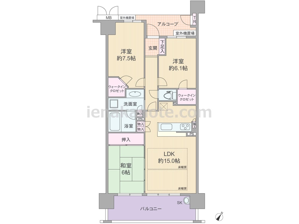 専有面積77.57平米の3LDK。どの部屋も6帖以上の広さがあるプラン。LDKは約15.0帖、キッチンはリビング・ダイニングを見ながら作業が出来る対面カウンター式です。LDKに隣接する和室6帖は個室やくつろぎのリビングスペースなど色々な使い方が可能。ウォークインクロゼットが2カ所あるなど収納が充実しており、トランクルームは外で使う物を収納するのにぴったり。スロップシンク付きのバルコニーは約12.35平米の広さがあります。