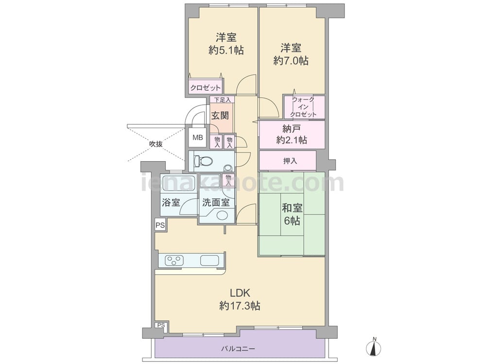 専有面積83.20平米の3LDK。南北両面に窓がある風通しの良いプラン。LDK約17.3帖と和室6帖の引き戸を開放すれば、約23.3帖大の空間としても利用可能。和室は室内廊下からも出入りでき、個室や客間としても使いやすくなっています。対面式キッチンは家事中も家族と会話を楽しめる配置。収納が豊富にあり、納戸約2.1帖はシーズンオフの家電や衣類を収納したり、日用品置場にも便利。浴室は吹抜に面した窓付きです。