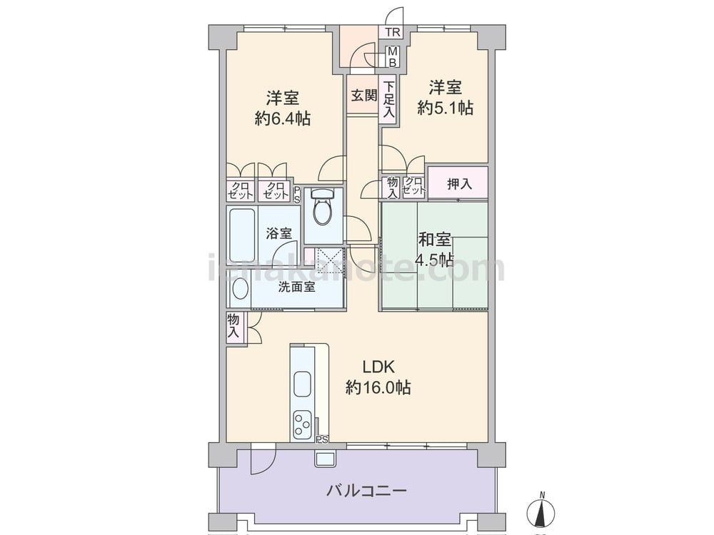 専有面積69.14平米の3LDK。キッチンはリビング・ダイニングを見ながら作業が出来る対面式で、洗面室・バルコニーへの動線が確保されています。LDK約16.0帖には和室4.5帖が隣接しており、和室は室内廊下からも出入りが可能。各居室に収納が確保され、玄関前のトランクルームはガーデニンググッズやスポーツ用品など外で使う物を収納するのにぴったりです。
