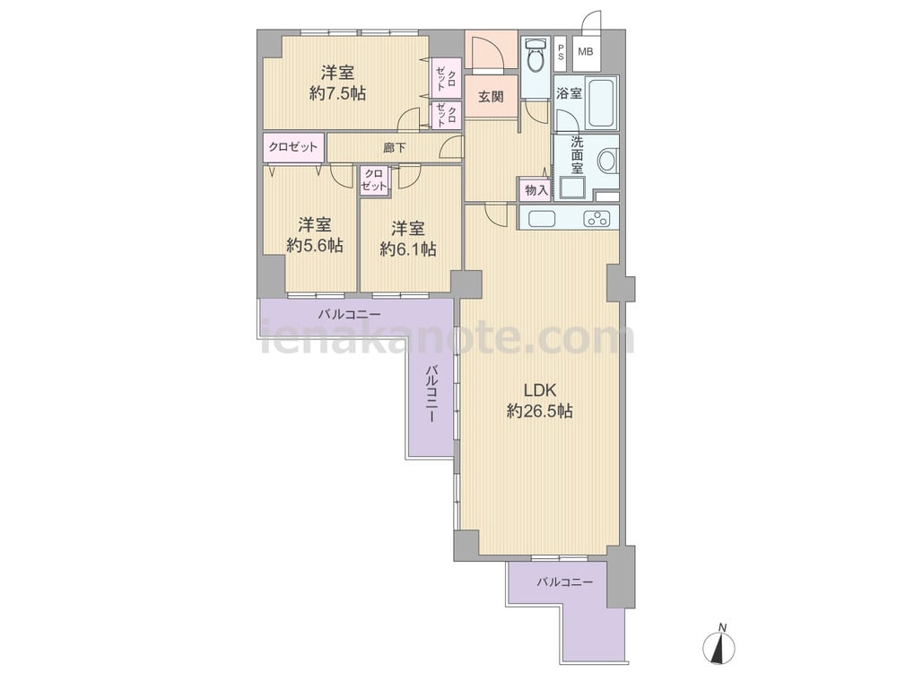 専有面積103.33平米の3LDK。LDKは約26.5帖と大変広く、二面採光の明るい一室です。キッチンは空間をゆったり使える壁付け・オープンタイプの仕様。LDKと居室は完全に仕切られており、人が集まるパブリックスペースとプライベートスペースに空間を分けて使えるのが特徴です。洋室約6.1帖のクロゼットは容量が少なく、家具の配置が必要かもしれません。洗面室前の物入は掃除機や日用品入れに便利。バルコニーが2カ所あり、南側バルコニーは一部出幅があります。