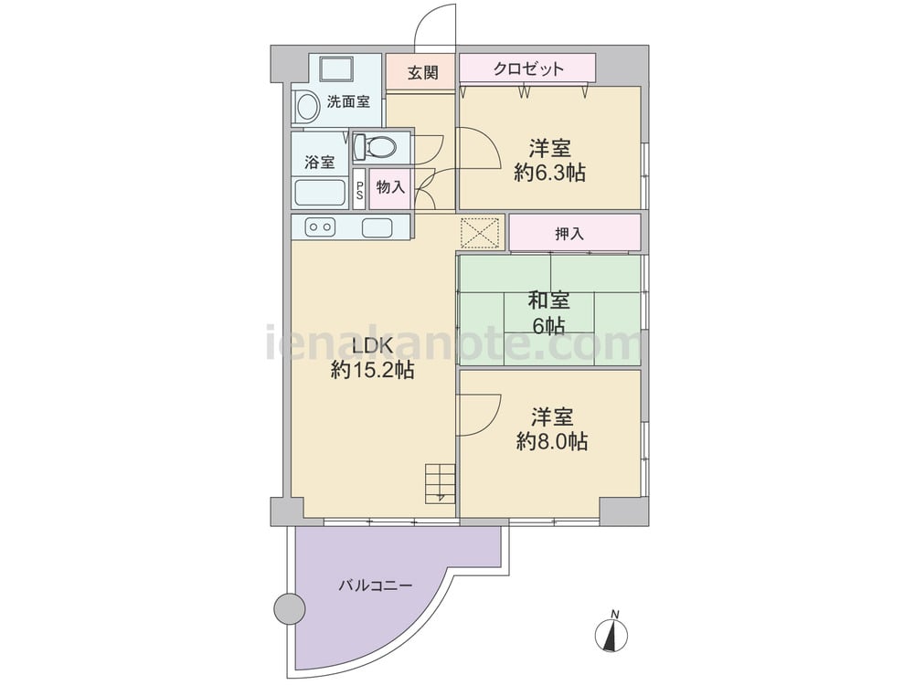 専有面積79.04平米の3LDK。全部屋6帖以上のゆとりが確保されたプラン。キッチンはI型のウォールタイプ。LDK横の和室は個室に利用したり、建具を外してリビングスペースにしたりと、色々な用途に使える一室です。二面採光の主寝室にはクロゼットが無いため、家具の配置が必要かもしれません。