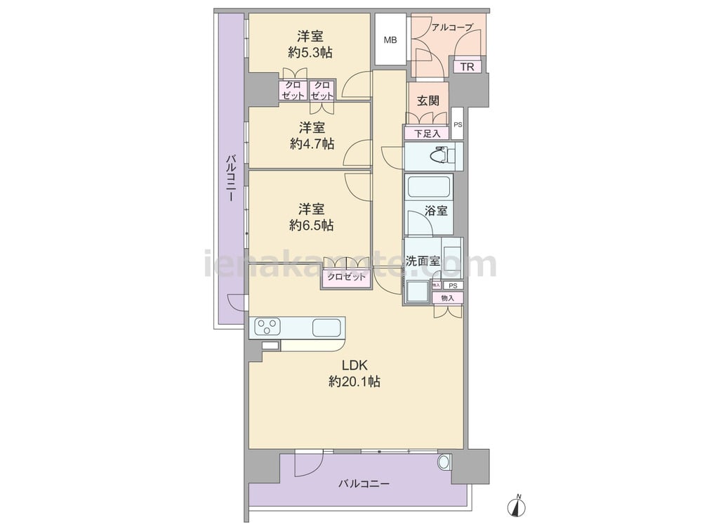 専有面積82.48平米の3LDK。共用廊下に直接面する窓が無く、全部屋バルコニーに面した独立性の高いプラン。LDKは約20.1帖大と広く、対面式キッチンからリビング全体を見渡す事が出来ます。キッチン横にはバルコニーへの勝手口付き。全部屋と洗面室に収納が確保され、玄関前のトランクルームは使う物を収納するのに便利です。南側バルコニーにはスロップシンクがあり、洗い物やガーデニングでの利用に活躍します。