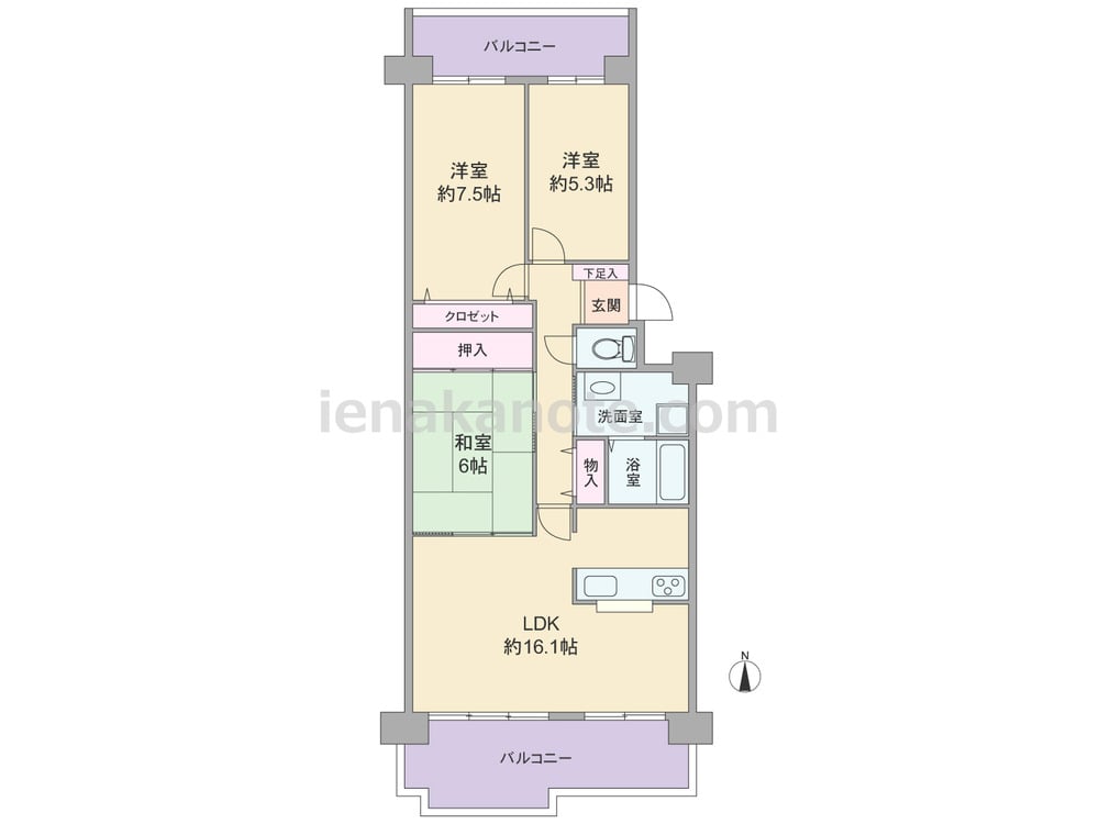 専有面積78.19平米の3LDK。共用廊下に直接面する窓が無い、センターインのプラン。LDKは約16.1帖あり、対面式キッチンは料理をしながら家族と会話を楽しめます。和室6帖へはLDKと室内廊下の2カ所からアクセスでき、くつろぎのリビングスペースや来客時の客間など色々な用途に利用可能。収納は和室と室内廊下、主寝室約7.5帖の3カ所に設けられています。南北両面にバルコニーがあり、ガーデニングもたっぷり楽しめそうです。