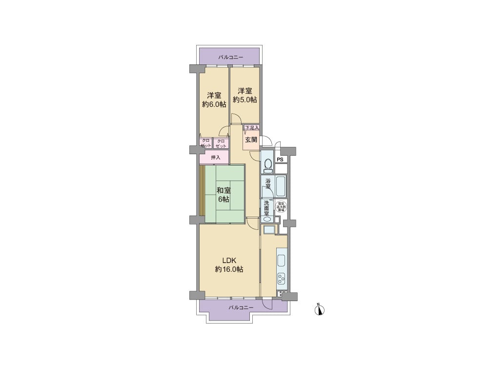 専有面積74.71平米の3LDK。センターインのプランで、南北両面にバルコニー付き。共用廊下に直接面する居室がなく、プライバシーが確保され、開放感があります。LDKと和室が続き間で、一つの空間としても使用可能。キッチンは独立型で、洗濯機置き場と勝手口がすぐ横にあり、家事動線にすぐれています。