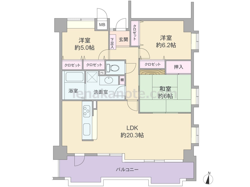 専有面積83.77平米の3LDK。LDKは約20.3帖大と広く、二面採光の明るい空間です。対面・カウンタータイプのキッチンはバルコニーへの勝手口が付いた2WAY動線。和室は室内廊下からも出入りでき、個室や客間にも使える一室です。収納スペースが豊富にあるのもポイント。バルコニーも約15平米とスペースにゆとりがあります。