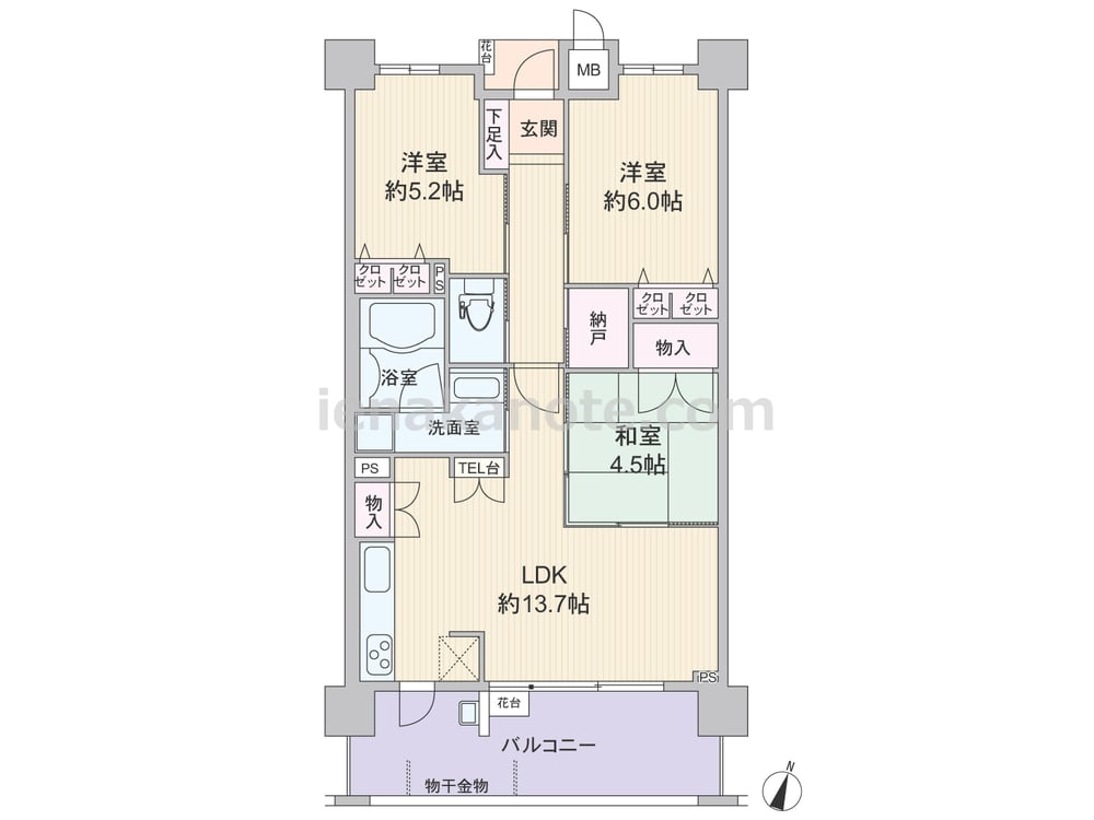 専有面積67.6平米の3LDK。玄関が共用廊下から奥まって配置されています。LDKに和室が隣接しており、引き戸を開けて2LDKに利用してもよさそう。壁付け仕様のキッチンは、バルコニーへの勝手口が付いた2WAY動線です。キッチン近くに物入、TEL台があるのもポイント。室内廊下の納戸は日用品、シーズンオフの物を収納するのにぴったりです。