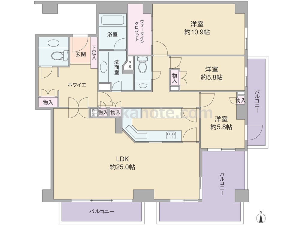 専有面積132.95平米の3LDK。玄関を入ってすぐにホワイエのある3ヶ所にバルコニーが付いたプラン。LDKは約25帖、主寝室は約10.9帖大。LDKは開放感のある二面採光。LDKと洋室に面したバルコニーは出幅があり、ガーデニングスペースやアウトドアリビングにもぴったりの空間。主寝室にウォークインクロゼット付き。キッチンを通って回遊できるようになっています。