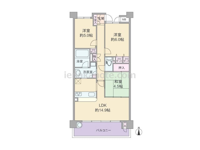 専有面積61.60平米の3LDK。センターリビングのプランで、キッチンは壁付け・オープンタイプ。和室・北側洋室・室内廊下の3カ所に収納スペース付き。LDKに隣接する洋室には収納スペースがありませんが、扉を開放すればLDKを広く使う事が出来...