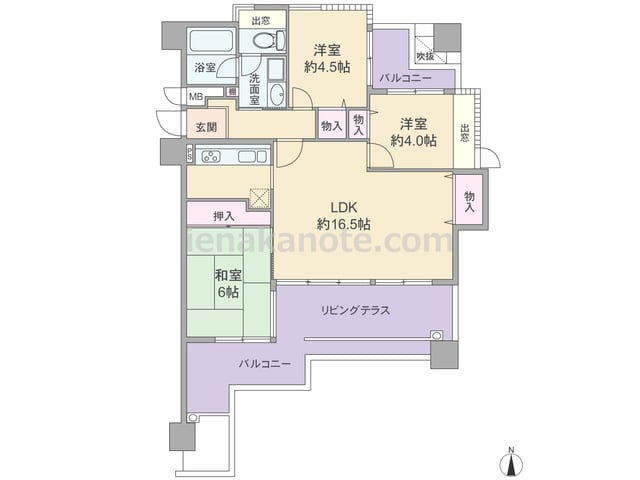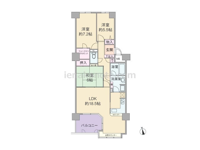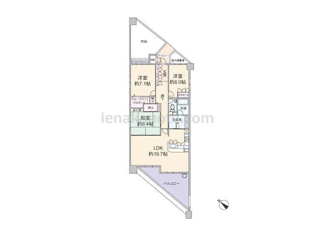 専有面積67.16平米の3LDK。居室の窓が直接共用廊下に面していない独立感のあるプラン。バルコニーが2箇所にあり、LDK以外は二面採光を確保しています。トイレにも明かり取り用の窓があります。キッチンは生活感の出にくい独立タイプ。トイレと...