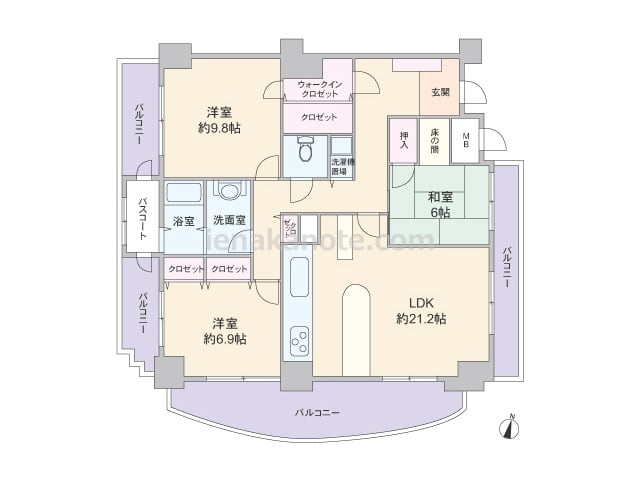 専有面積110.66平米の3LDK。全室バルコニーに面し、6帖以上の広さがあるプラン。住居の窓が共用廊下に面していないためプライバシーが確保されています。二面採光のLDKは約21.2帖大と開放感があり、キッチン背面には便利なカウンター付き...
