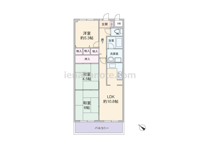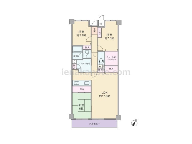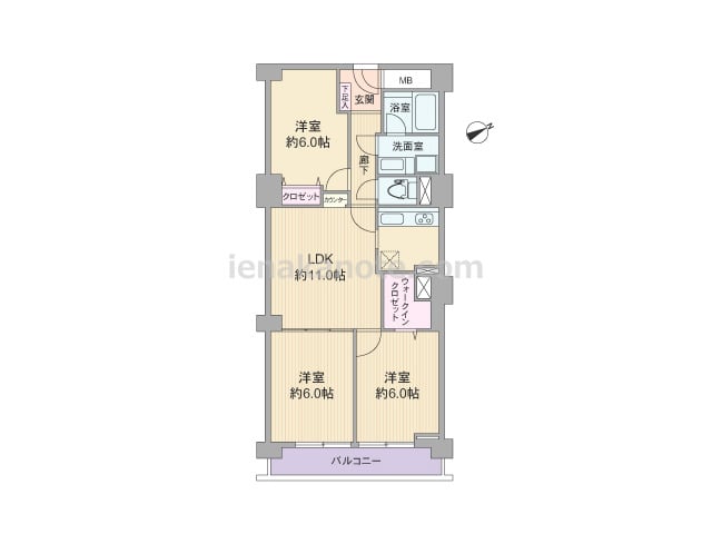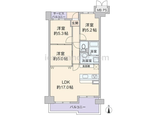 専有面積67.13平米の3LDK。LDKは約17.0帖、キッチンは家事をしながら家族とコミュニケーションが取りやすいカウンタータイプ。居室にクロゼットなどの収納スペースが無いため収納家具を置くなどの工夫が必要ですが、洋室約5.3帖・洋室約...