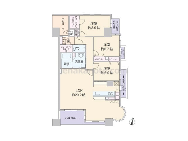 専有面積111.17平米の3LDK。玄関前にアルコーブがあり、玄関から居室を見通せない造りでプライバシーを確保。玄関にはシューズボックスとシューズインクロークがあります。LDKは約29.2帖大と広く、リビングの一角にあるアールを描く壁がポ...
