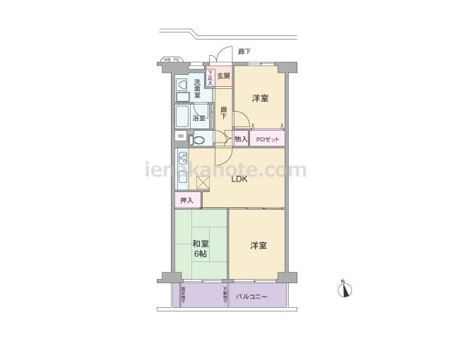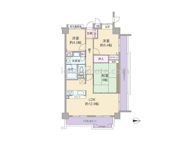 専有面積65.29平米の3LDK。LDK約12.9帖は通風・採光にすぐれた二面採光。カウンタータイプのキッチンは料理をしながら家族と会話を楽しむ事が出来ます。和室6帖は室内廊下とLDKの2カ所から出入りでき、LDK側の襖を開放すれば約18...