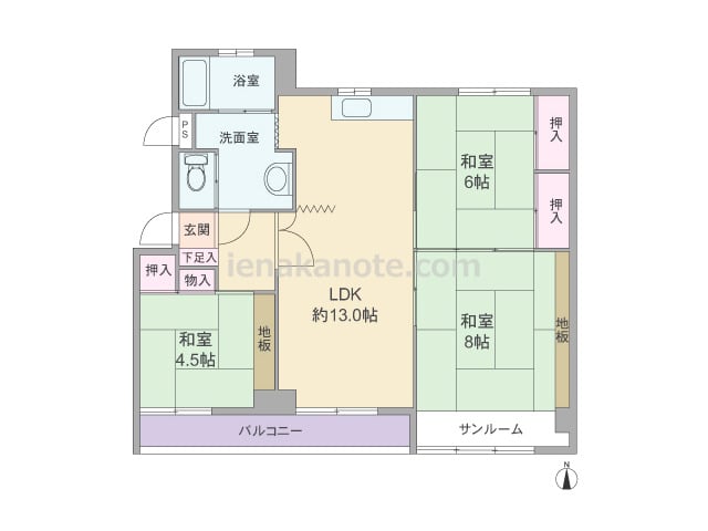 専有面積79.04平米の3LDK。居室の窓が共用廊下に面していない、プライバシーを保ちやすい造りです。LDK以外は和室の落ち着いたプランで、LDK約13.0帖と和室6帖・和室8帖は続き間になっています。和室8帖には収納スペースがありません...