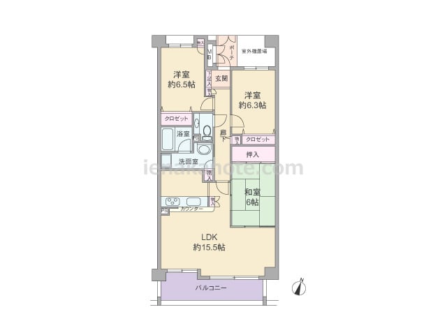 専有面積78.41平米の3LDK。どの部屋も6帖以上の広さがあるプラン。玄関前にはプライバシーに配慮された専用ポーチが付いています。LDKは約15.3帖、独立型のキッチンはリビング・ダイニングに生活感が出にくい造り。和室6帖には明るく・開...