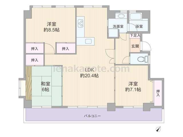 専有面積88.15平米の3LDK。LDKを含む3部屋が南東向き・ワイドスパンのプラン。どの部屋も6帖以上あり、LDKは広々約20.4帖大。和室6帖、洋室約7.1帖の引き戸を開放すれば1LDKとして使う事も出来ます。各居室に収納スペース付き...