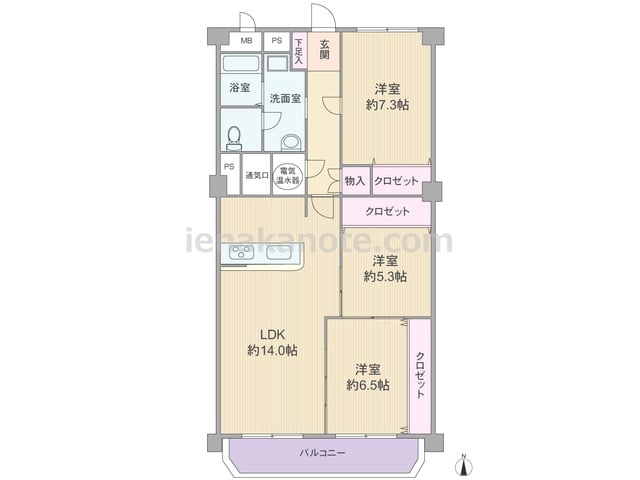 専有面積79.95平米の3LDK。LDK約14.0帖と洋室約5.3帖、洋室約6.5帖が続き間になったプラン。どの部屋にもクロゼットがあるため個室として使いやすく、引き戸を開放すれば空間を広々と使えるなど、生活シーンに合わせてフレキシブルに...
