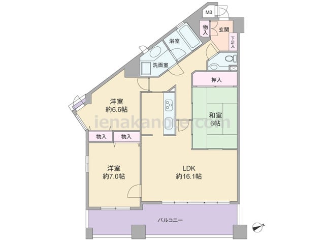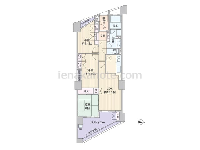 専有面積82.16平米の3LDK。居室の窓が共用廊下に面しておらず、玄関先から室内を見通せない、プラバシー重視のプラン。どの部屋も6帖以上のゆとりがあります。LDKは約16.1帖、生活感の出やすいキッチンは独立型。和室6帖は扉が3カ所あり...