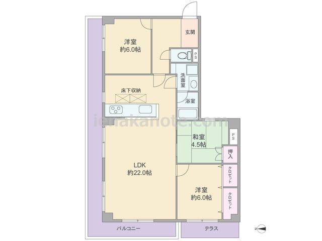 専有面積81.7平米の3LDK。共用廊下に直接面する窓が無く、玄関先から室内が見通せない、プライバシー重視のプラン。LDKは約22.0帖大と広く、対面式のキッチンは作業をしながらもリビング・ダイニングを見渡す事ができます。和室4.5帖を小...