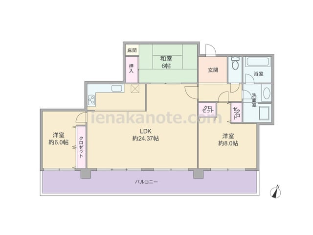 専有面積95.51平米の3LDK。南東向き・ワイドスパンのプラン。居室の窓が共用廊下に面していないため、プライバシーを保ちやすい造りです。どの部屋も6帖以上あり、LDKは広々約24.37帖大。和室の襖を開放すれば約30.37帖大の空間とし...