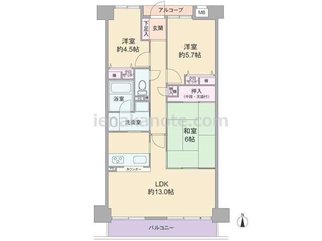 専有面積66.12平米の3LDK。玄関前にはプライバシーに配慮されたアルコーブがあります。LDK約13.0帖に隣接する和室の襖を開放すれば、リビング・ダイニングの延長としての利用にぴったり。対面式のキッチンは作業中も家族と会話を楽しめます...