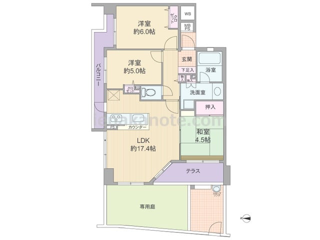 専有面積68.05平米の3LDK。玄関前にアルコーブ付き。キッチンは対面カウンター式で、便利な勝手口付き。LDKと和室が続き間で、約21.9帖大。LDKは明るい2面採光。浴室にも窓があり、換気がしやすく快適。専用庭、テラスがあり、ガーデニ...