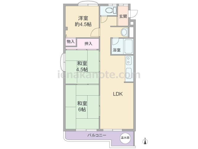 専有面積45.83平米の3LDK。居室の窓が共用廊下に面していない、プライバシーを確保しやすいプラン。和室4.5帖と和室6帖は続き間になっており、引き戸を開放すれば10.5帖大の一室にする事が出来ます。また、LDKとの間の引き戸を開放して...
