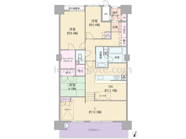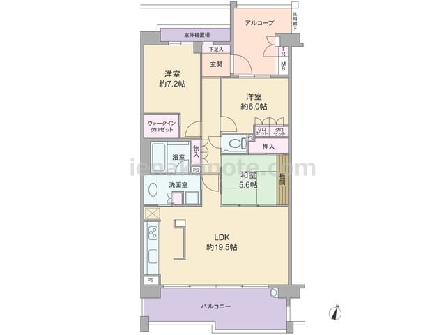 専有面積87.31平米の3LDK。玄関前にアルコーブがあり、共用廊下に直接面する居室が無い、プライバシー性の高いプラン。LDKは約19.5帖大の広さがあり、生活感の出やすいキッチンはリビング・ダイニングとの間をゆるやかに仕切られています。...