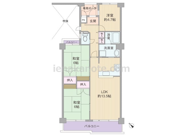 専有面積71.93平米の3LDK。玄関前に専用ポーチがあります。LDKは約13.5帖、キッチンはL字型の対面タイプ。キッチン背面には洗面室への扉があります。LDKと和室二部屋が続き間になっており、床間は花や掛け軸を飾れば和の雰囲気を演出可...