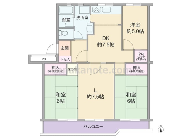 専有面積71.87平米の3LDK。南向き・ワイドスパンのプラン。どの部屋もDK約7.5帖を通って行き来するため、家族のコミュニケーションの機会が増えます。リビング約13.5帖には収納がありませんが、隣接する和室の引き戸を開放すれば約13....