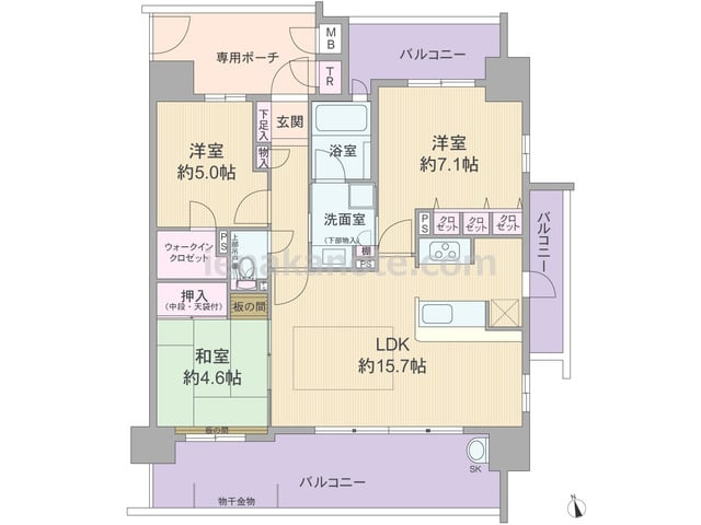 専有面積72.85平米の3LDK。玄関前に専用ポーチがあり、共用廊下に居室の窓が面していない、プライバシーを確保したプラン。LDKは約15.7帖、キッチンはニの字型・対面カウンタータイプ。キッチン横にバルコニーへの勝手口があります。主寝室...