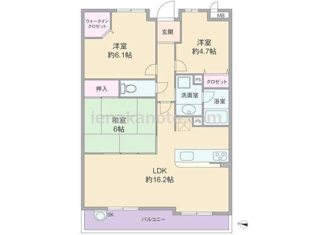専有面積92.32平米の3SLDK。センターインのプラン。LDK約16.2帖には和室6帖が隣接しており、引き戸を開放すれば空間をより広々と使う事が出来ます。キッチンは独立型で、洗面室、洋室約6.0帖へアクセス可能な3WAY動線。各居室に収...