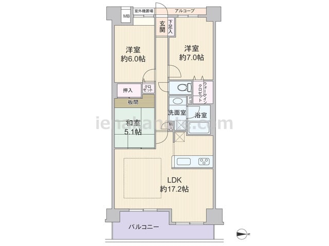 専有面積77.5平米の3LDK。玄関・居室と共用廊下の間にはアルコーブがあります。LDKは約17.2帖とゆとりがあり、和室の引き戸を開放すれば約22.3帖大の空間に。和室には板間も設けられています。主寝室約7.0帖にはウォークインクロゼッ...