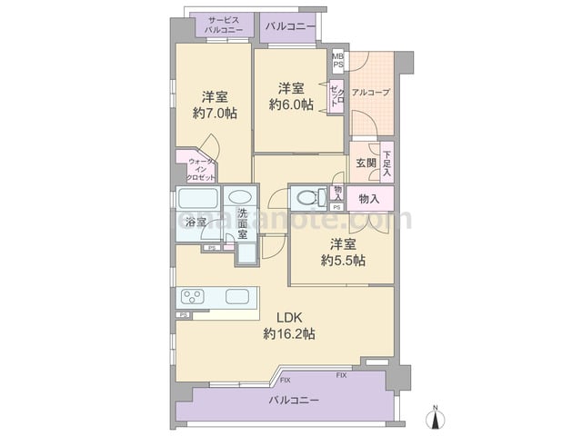 専有面積76.05平米の3LDK。玄関前にアルコーブ、共用廊下と居室の間にバルコニーが付いたプライバシー性の高いプラン。LDK約16.2帖はコーナーサッシが用いられ、キッチンは料理中もリビング・ダイニングを見渡せる対面式。各居室と玄関ホー...