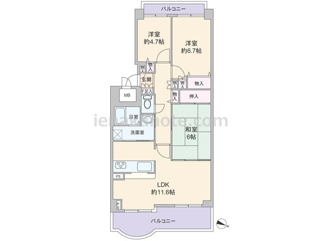 専有面積71.9平米の3LDK。東西両面にバルコニーが付いたセンターインのプラン。LDK約11.6帖は一部コーナーサッシが用いられ、隣接する和室の引き戸を開放すれば約17.6帖大の一室に利用できます。和室は室内廊下からも出入りでき、来客時...