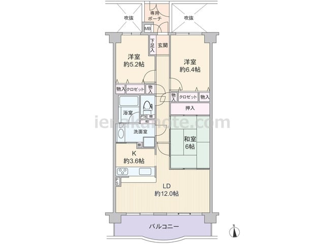 専有面積76.80平米の3LDK。共用廊下と居室の間には吹抜、玄関前には専用ポーチが付いたプライバシー性の高いプラン。対面・カウンタータイプのキッチンは洗面室へアクセス可能な2WAY動線です。和室6帖もLDKと室内廊下の2カ所から出入りで...