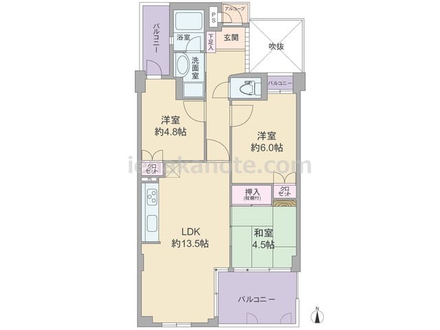 専有面積62.26平米の3LDK。玄関ホールは吹抜に面してガラスブロックがあります。LDK約13.5帖にはコーナーサッシが用いられ、和室の引き戸を開放すればリビング・ダイニングをより広々と使う事が出来ます。各居室に収納があり、浴室の窓は湿...