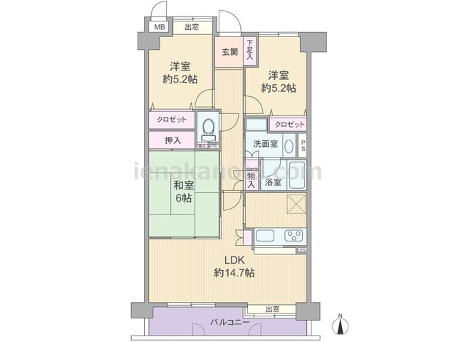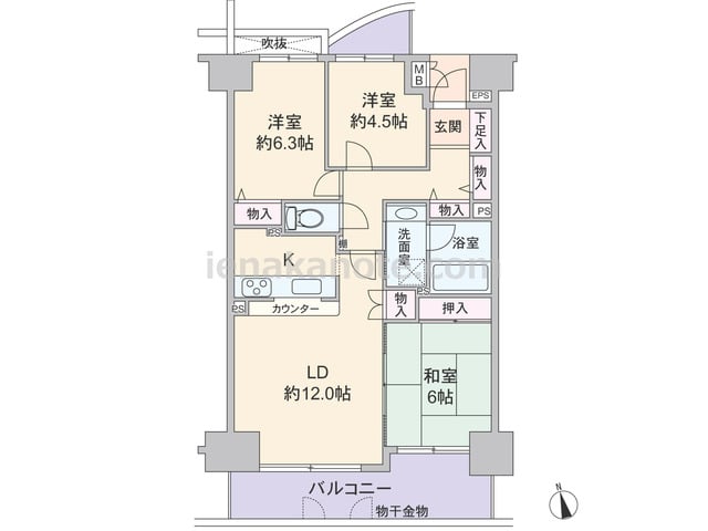 専有面積71.72平米の3LDK。居室の窓が共用廊下に直接面しておらず、玄関先から室内を見通せない、プライバシーを保ちやすいプラン。キッチンは料理中も家族の顔が見える対面式です。洋室約4.5帖には収納がありませんが、その他の居室とLDK、...
