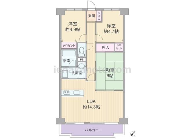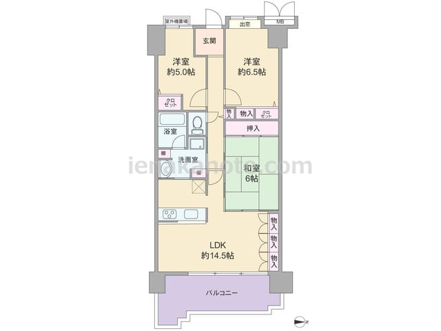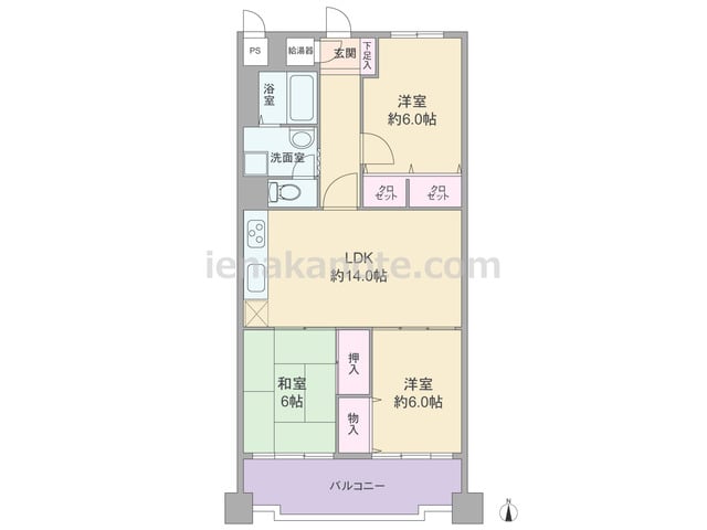 専有面積67.1平米の3LDK。横長リビングのプラン。LDKは約14.3帖、オープンキッチンの背面には洗面室への扉があります。和室6帖は2カ所から出入りでき、来客時には室内廊下から出入りする客間に利用する事も可能。各居室に収納が設けられて...