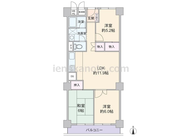 専有面積64.80平米の3LDK。玄関扉は防犯性に配慮された内開き型です。LDKが部屋の中央にあるセンターリビングのプランで、キッチンは空間を有効利用できるI型のウォールタイプ。洋室約6.0帖にはクロゼットがありませんが、その他の居室と玄...