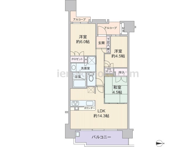 専有面積64.94平米の3LDK。横長リビングのプラン。LDK約14.3帖と続き間の和室4.5帖があり、引き戸を開けるとより広々とリビングを使う事ができます。和室は室内廊下からも出入りが可能。対面カウンター式キッチンは、料理中も家族と会話...