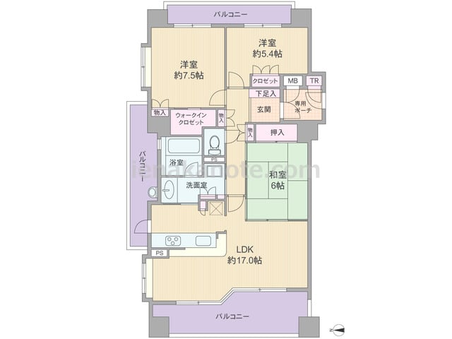 専有面積74.9平米の3LDK。玄関先から室内を見通せない、プライバシー性の高いプラン。どの部屋もLDK約12.8帖を通って行き来し、和室は引き戸を開放すれば12帖の一室にする事が出来ます。各居室に収納があり、トイレ内に手洗いカウンター付...