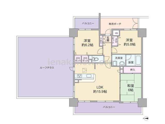 専有面積72.08平米の3LDK。玄関前に専用ポーチがあり、共用廊下に直接面する窓が無い、プライバシー重視のプラン。LDKは約15.9帖、キッチンは対面カウンタータイプの仕様。和室の引き戸を開放すれば、約21.9帖大の空間に利用出来ます。...