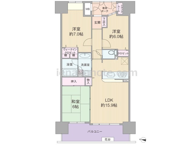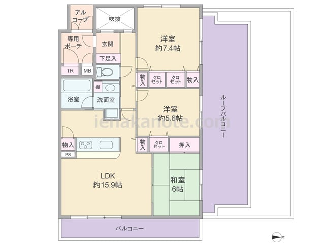 専有面積77.49平米の3LDK。全部屋バルコニーとルーフバルコニーに面する明るく・開放的なプラン。玄関前にはアルコーブや専用ポーチがあるなど、プライバシーの高い造りです。玄関ホールは吹抜に面して窓付き。LDK約15.9帖と和室6帖の引き...