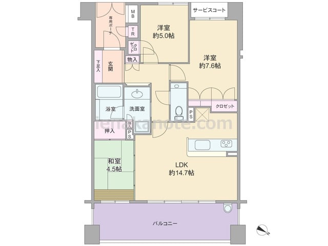 専有面積80.21平米の3LDK。玄関前に専用ポーチがあり、共用廊下に面する窓が無い、プライバシー性の高いプラン。専用ポーチ内にトランクルーム、玄関横ににシューズインクロークが設けられています。LDK約15.6帖はアールの窓が特徴的。L字...