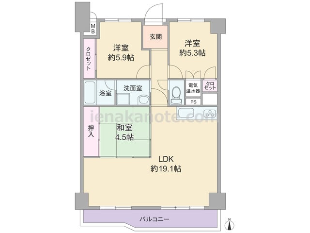 専有面積76平米の3LDK。LDKは約19.1帖とゆとりがあり、キッチンは空間を広々使える壁付けタイプです。和室4.5帖へはLDKから出入りし、引き戸を開放すれば、約23.6帖大の空間としても利用可能。洋室約5.3帖のクロゼットは容量が少...