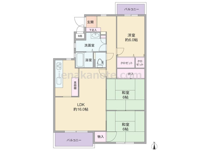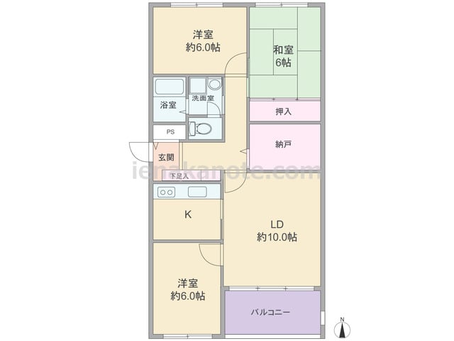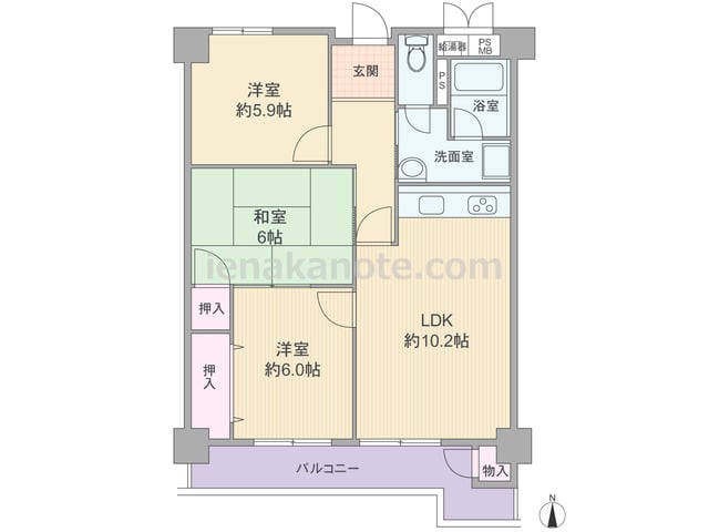専有面積68.65平米の3LDK。LDKは約10.2帖、キッチンはリビング・ダイニングをゆったり使えるI型のウォールタイプ。和室6帖は玄関ホールと洋室約6.0帖の2カ所から出入りが可能。和室と洋室約6.0帖に収納があり、バルコニーの物入は...