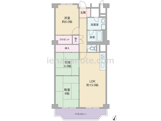 専有面積66.64平米の3LDK。専用庭が付いたプラン。LDKは約13.0帖、キッチンは壁付けタイプで、キッチン前に窓があります。洋室約4.5帖を個室として利用するには建具を用意したり、カーテンで仕切るなど工夫が必要です。洋室約6.0帖は...
