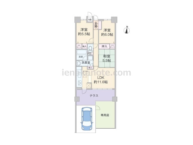 専有面積66.93平米の3LDK。テラスと専用庭があり、専用庭から直接出入りのできる専用駐車場も付いている、一戸建て感覚を味わえるプラン。LDKは約11.6帖、キッチンには勝手口が付いており、洗面室へも行き来のしやすい家事効率の良い3WA...