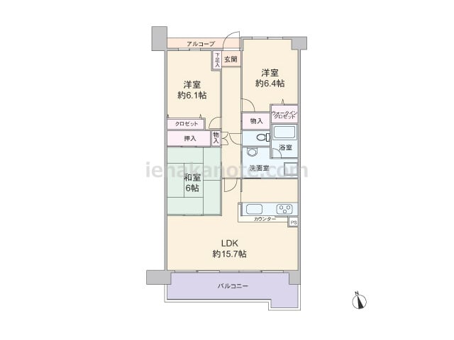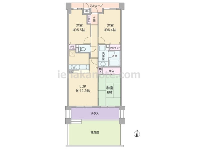 専有面積64.82平米の3LDK。専用庭付きのプラン。共用廊下と玄関・居室の間にはアルコーブがあります。LDK約12.2帖には和室6帖が隣接しており、襖を開放すればリビング・ダイニングをより広々と使う事が可能。キッチンは対面・カウンタータ...